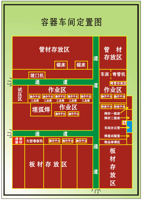 公司設有:高壓容器焊接車間、機工車間、箱體車間、調試車間、裝配車間和庫房。其具體分布如下:
